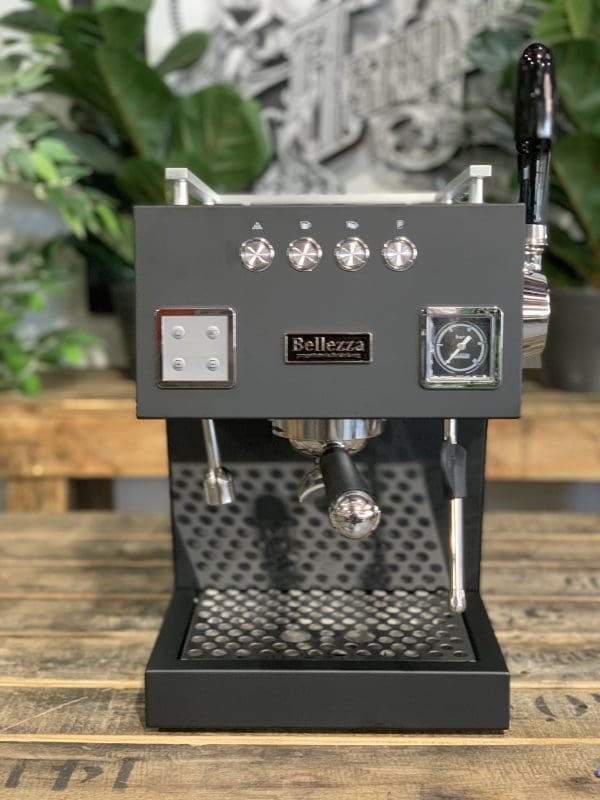 The Bellezza Bellona is a modern dual-boiler espresso machine designed for precision and versatility. Finished in a sleek matte black, it features a unique external glass water tank that can be easily removed for cleaning or refilling. For permanent installations, the machine is also equipped with the capability to be plumbed directly into a main water line.