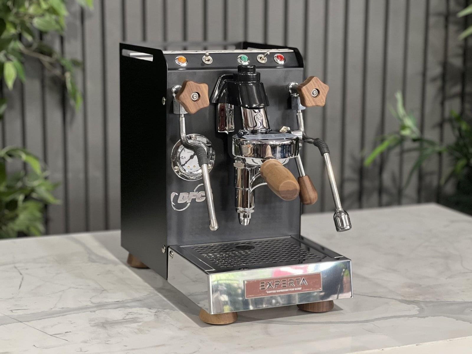 The BFC Experta is a masterpiece of Italian craftsmanship, designed for the coffee purist who demands professional-grade internals in a stunning, bespoke aesthetic. This brand-new unit features a sophisticated matte black body accented with custom timber handles and panels, creating a luxurious look that bridges the gap between industrial power and organic warmth. It is the perfect centerpiece for a high-end home espresso bar, a boutique studio, or an executive office.