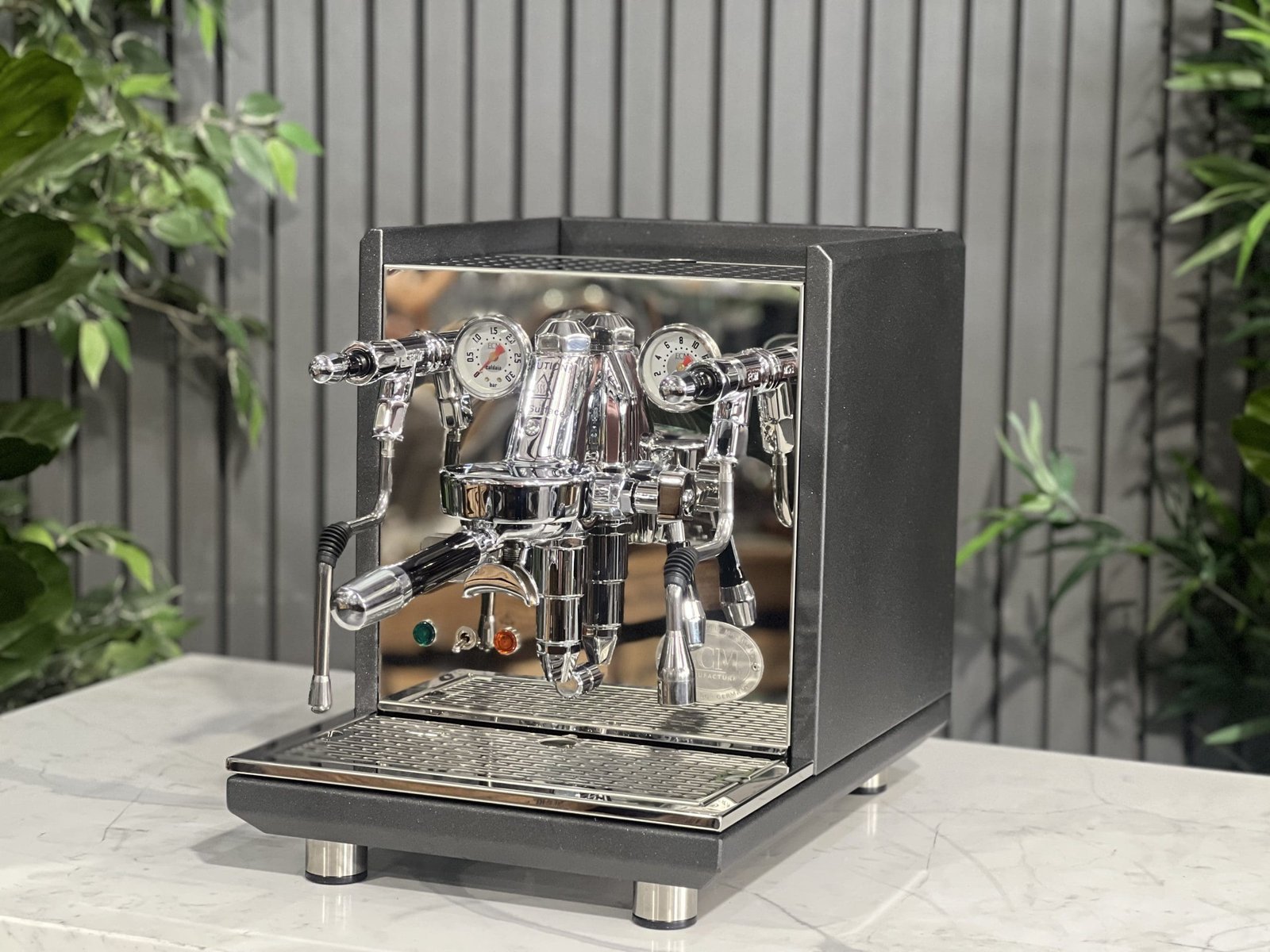 Anthracite Finish: Distinctive powder-coated dark grey side panels provide a modern, sophisticated look distinct from standard all-chrome machines.