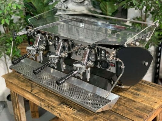 The Kees Van Der Westen Mirage Triplette is an industry-leading 3-group espresso machine that serves as a modern evolution of the classic heat-exchanger system. This specific used unit is finished with professional Black Side Panels, offering a sleek, stealthy look that complements high-end industrial or modern cafe interiors.