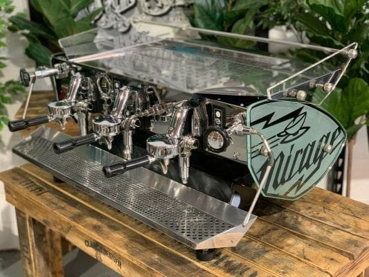The Kees Van Der Westen Mirage Triplette is a commercial powerhouse that redefined the possibilities of the heat-exchanger system upon its release in 2001. This specific used unit features the iconic Mirage Glass side panels, sandblasted into 10mm (0.4 in) thick glass, giving the machine its signature transparent and industrial look.